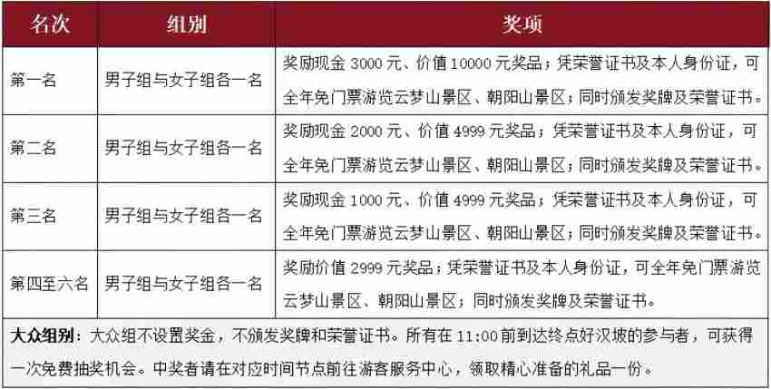 1.山地徒步竞赛组与徒步大众组两个组别,不设奖金,仅为获奖团队颁发团队奖杯或奖牌。两个组别人员在关门时间完成全程者,将颁发官方的《完赛证书》。