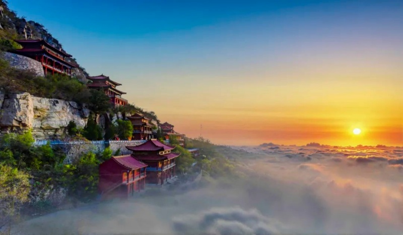 “千年古刹悬空寺 殷商行宫朝阳山”,朝阳寺 依山而建,绝壁而生,遥望如空中楼阁,又名朝阳悬空寺。碑刻记载:“南北朝东魏武定七年,荥阳郑元伯,历时55年,在此敬营石室一门,镌刻佛像八万四千尊。”明清《淇县志》记载:朝阳寺原为殷故宫,是纣王冬季采暖的行宫遗址。朝阳山,又名尖山,海拔603米,是纣王设坛祭天处,孔子携弟子登高健身、祈福纳祥之地,素有“中原小泰山”之称。朝歌寨,海拔703米,是纣王建寨屯兵处,更是户外运动爱好者登高望远、挑战极限的理想目的地。